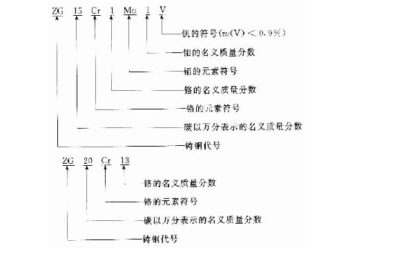 (3)鑄造合金鋼包括以化學成分為主要驗收依據的鑄造中、低合金鋼和高合金鋼,命名方法是在ZG后面用1組數字表示鑄鋼的名義萬分表示的碳的質量分數。在碳的名義含量數字后面排列各主要合金元素符號,每個元素符號后面用整數標出其名義質量分數。
